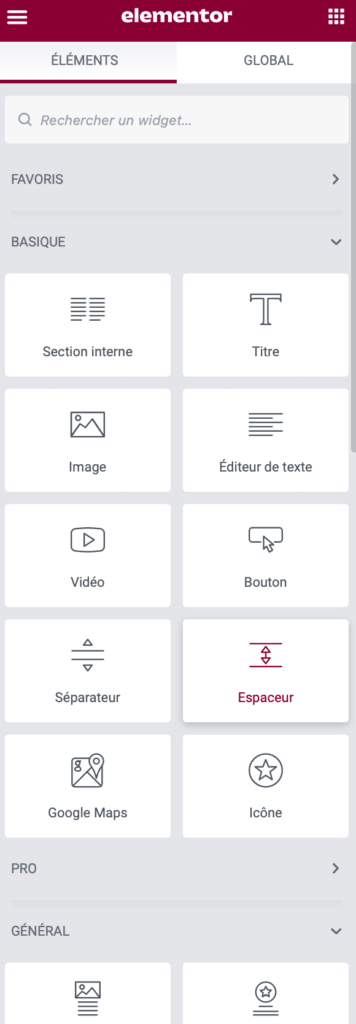 Une fois votre section choisi, vous pouvez facilement choisir des éléments pour les compléter. Ces éléments, appelés « Widgets » peuvent être multiples : des titres, des textes, des images, des boutons, des carrousels,… Il en existe plus d’une trentaine accessible dans la version gratuite d’Elementor.